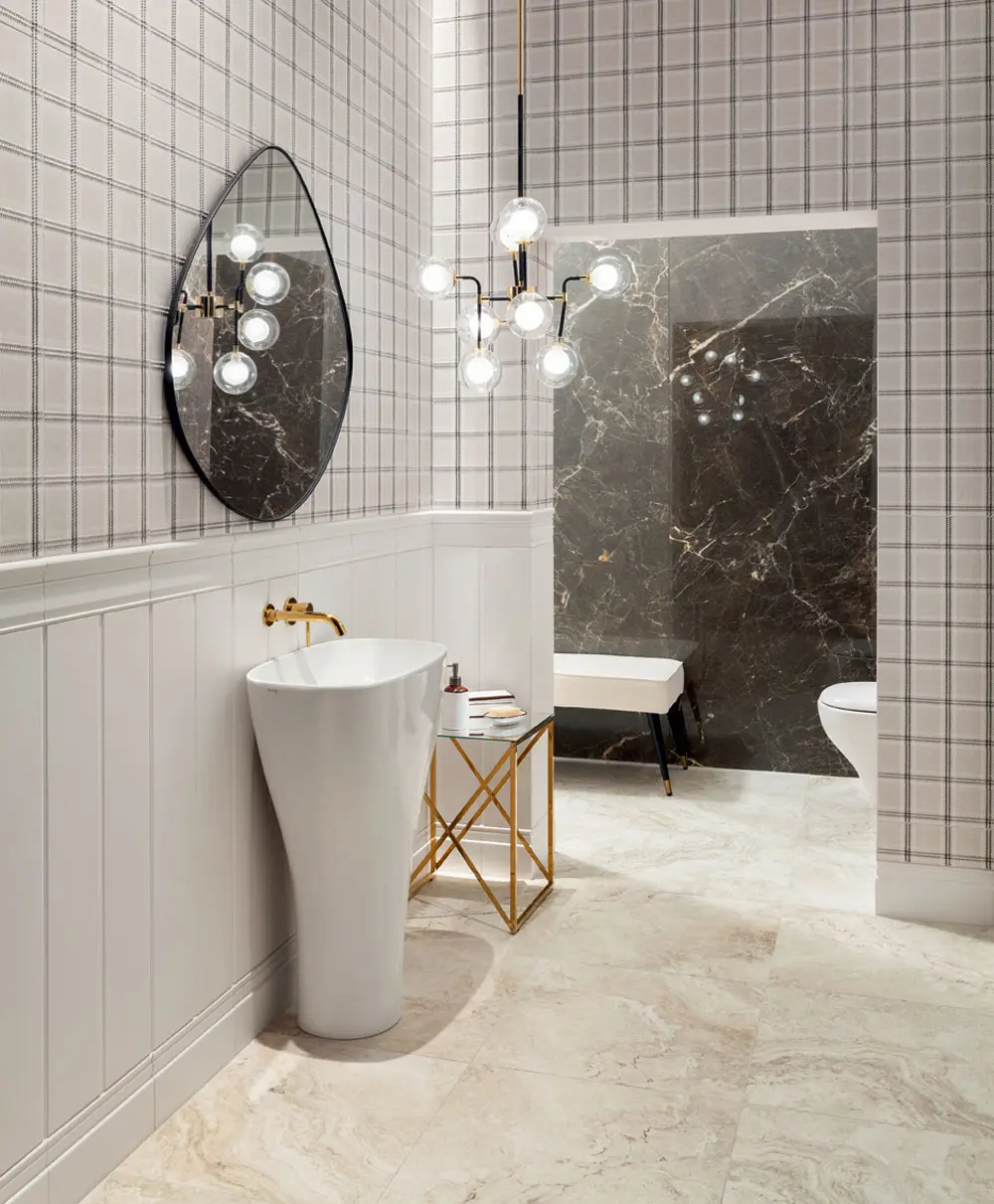 Klasyczna forma nabiera nowoczesnej subtelności i miękkości. Charakterystyczna duża krata – symbol angielskiego wzornictwa – przywodzi na myśl kultowe projekty domów mody, arystokratyczną elegancję i szlachetne tkaniny. W połączeniu z klasyczną boazerią tworzy dekorację godną luksusowych, butikowych hoteli.