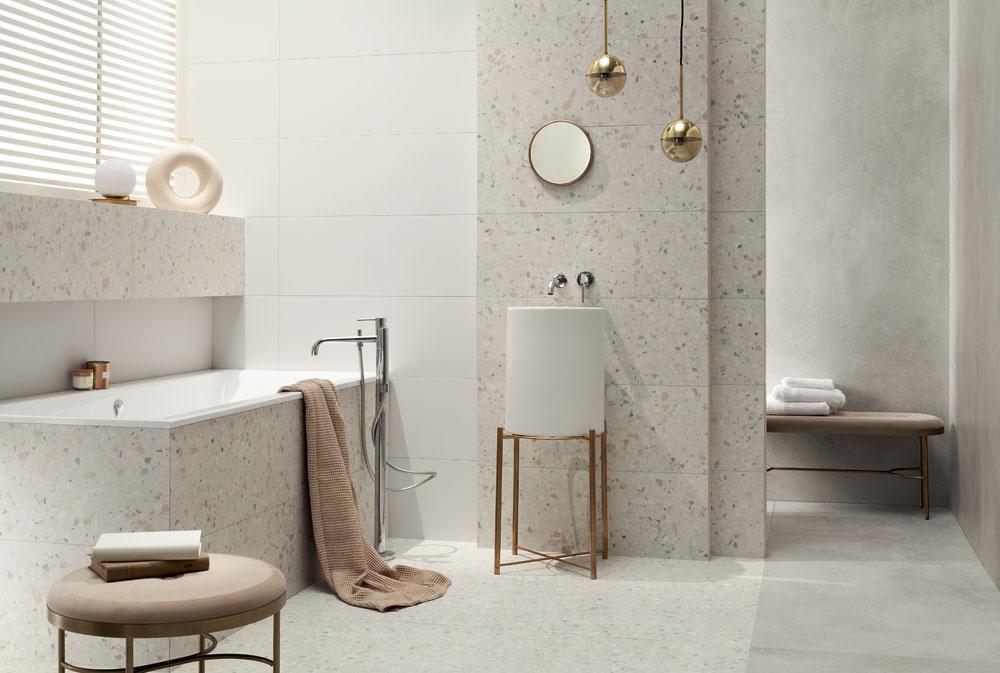 Kolekcja Macchia, inspirowana klasycznym weneckim terrazzo, zachwyca kunsztownym wykończeniem glazury i naturalną fakturą kamienia. Gładko wypolerowane kamyki lśnią na tle głębokiego matu, tworząc intrygujący kontrast. Odmiany Blue i Graphite wyróżniają się wyrazistym charakterem, podkreślonym przez mocniejszy kontrast elementów mineralnych. Wersje Beige i Grey zachowują subtelną harmonię dzięki stonowanym barwom i jednolitej strukturze. Płytki ścienne dostępne są w rektyfikowanym formacie 33x90 cm, a uniwersalny gres podłogowy – w klasycznych kwadratach 60x60 cm.