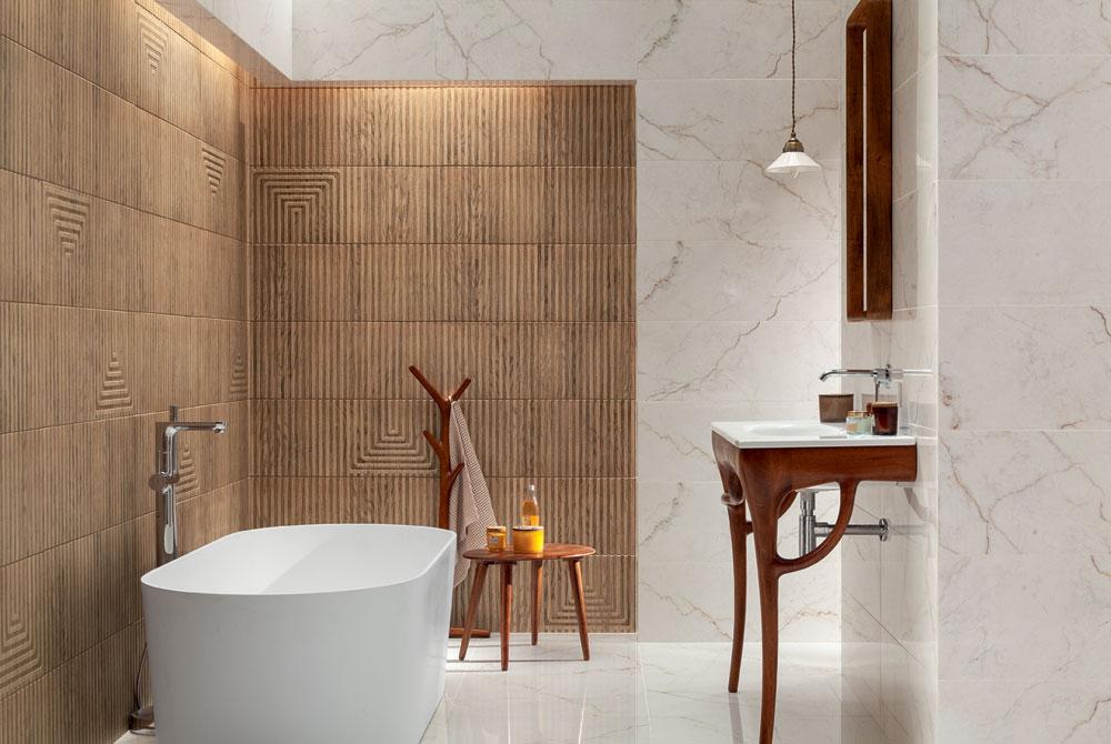 Kolekcja Liberte to propozycja dla tych, którzy pragną stworzyć przestrzeń pełną swobody i harmonii. Ciepły, orzechowy odcień drewna subtelnie łagodzi surowość kamienia, a kwiatowy dekor dodaje aranżacji delikatności. Inspiracją dla wzoru lameli była naturalna regularność spotykana w przyrodzie – rytmiczne, pionowe linie tworzą efekt głębi i trójwymiaru, podkreślając elegancki i ponadczasowy charakter wnętrza.